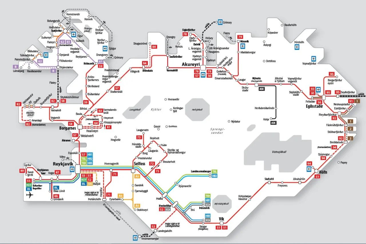 Public transport in Iceland is limited compared to mainland Europe. In Reykjavík, Strætó buses serve the city and nearby towns. Long-distance buses connect major towns and tourist areas, but schedules are infrequent and seasonal.
